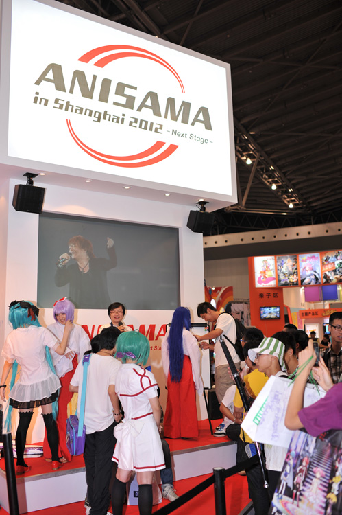 ANISAMA的展台位于会场入口不远处,从7月12日开幕第一天起,展台就开始了将于今年10月27日举办的ANISAMA IN SHANGHAI 2012演唱会预约券的销售工作。本届演唱会的门票是通过发售预约券,再用预约券来抵价换取实体门票的方法来销售的。不论哪种价位的门票,预约?都是200元。预约券在ANISAMA的官网上也有销售,但只有在位于CCG会场的ANISAMA展台上够买的预约券,才拥有正式换票时自主选择座位的特权。因此展会期间,每天都有许多动漫迷早早地在展台边排起了长队,只为能在正式换取门票时,可以选择心仪的位置,从自己最喜欢的角度观赏众巨星们的演出。至于预售券换取入场门票的安排和说明,还请诸位动漫迷关注ANISAMA IN SHANGHAI的官方网站和官网微博的通知。
