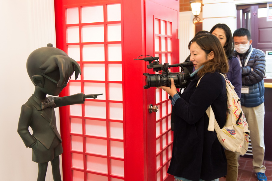 随着其他几位领导的致辞和剪彩仪式的结束,等待已久的粉丝们瞬间挤满了店堂。有拿着答题卡四处寻找答案的,有排队参加甜点蛋糕畅吃的,有挑选柯南正版书籍和周边的,有兴高采烈地试穿少年侦探团服装道具的。吸引最多粉丝目光和镜头的是店里那尊柯南的塑像,以及有轨电车和电话亭的布置,大家纷纷上前合影留念。不一会儿收银处已经排了长长的队伍,一身少年侦探团打扮的工作人员热情地为大家服务着,还有几位热情的粉丝身着COS服出现在了现场,其中更有一位全身黑色,只露出双眼和嘴的角色——是的,这正是《名侦探柯南》系列中最经典的犯人形象,“黑衣人”的出现赢得了无数的欢呼,也谋杀了现场媒体与粉丝们无数的快门,整个店堂都沉浸在浓浓的欢乐气氛中。