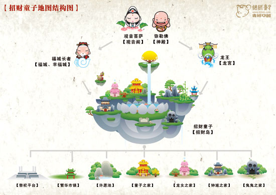 招财童子系列的组织背景是一套完整的、独立的系统,包括招财家族众多人物和天宫、神殿、观音阁、大福城、龙宫、招财岛等系列场景。需要指出的一点是,还有许多大反派和小怪物是没有和朋友们见面过的,我们会陆续为广大的童丝揭秘......招财童子系列与《封神榜》系统和《西游记》系统相互影响,相互渗透。