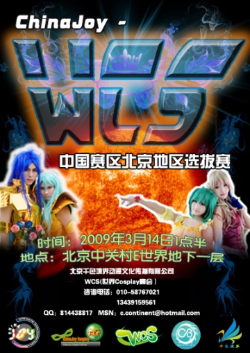 2009年度ChinaJoy-WCS中国赛区北京地区选拔赛将于本月14日下午1点半在北京中关村e世界数码广场A座负一层正式打响。在ChinaJoy组委会和ChinaJoy-WCS中国赛区北京地区选拔赛主办方北京千色境界动漫文化传播有限公司的大力宣传下,本次ChinaJoy-WCS中国赛区北京地区选拔赛比赛受到了全国广大动漫爱好者的热烈欢迎和全国青少年的广泛关注,同时也得到了各界媒体的积极响应。截至目前,北京赛区主办方已收到来自北京、天津等地区爱好者的报名表30余份,志愿者报名表100余份。