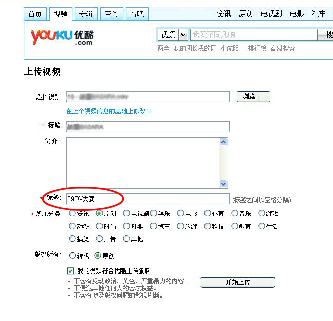 预先提交作品的参赛选手请登录优酷网www.youku.com,注册用户名后将参赛视频直接上传 ,上传参赛视频时必须为视频添加“09DV大赛”标签。