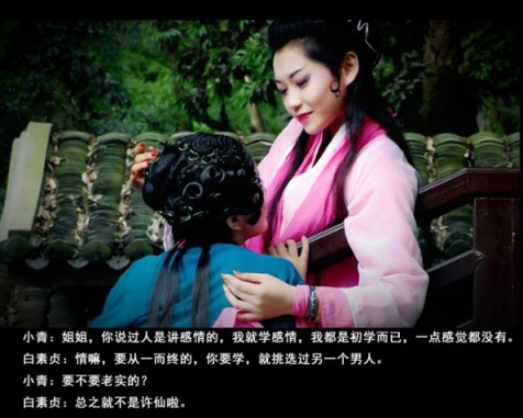 美艳成熟的白蛇,媚情顽皮的青蛇,幻化人形来到世间。昆剧的妆容,在一片郁葱丛的荷花淀更显得妩媚风情。偶遇许仙,爱意萌生,便有了之后的故事。故事从青蛇的不懂爱开始,懵懂、找寻。端午显性,书生吓破胆。接下来好似传说中那般情节,青白蛇共赴昆仑山寻求灵芝仙草以救许仙俗命。大战法海,水漫金山,白蛇产子,直到青蛇最后流下一颗名叫做“明白”的眼泪。影片没有出现文弱书生许仙特写,仿佛他的存在只是青白两个语言的道具一般。有的只是青白两人柔肠百转的心事,以及烟雨缥缈,雾霭朦胧,宛若人间仙子的一双倩影。
