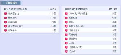 手机游戏类“最佳移动平台单机游戏”中排名第一的《海扁西游记》已获222票,而《DNF:地下城与勇士》以70票的总票数在“最佳移动平台网络游戏”中暂列第一。