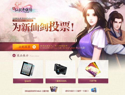 骏梦游戏为支持《新仙剑奇侠传online》玩家准备的奖品,除了常规的ipad2和三星数码相机两大热门电子产品和骏梦一卡通虚拟充值卡,还有官方特别订制的《新仙剑奇侠传online》主题T恤和书签,如果你是一位籼米,请千万不要错过收藏它们机会,赶紧按照下面给出的方式为新仙剑投票或拉票吧!