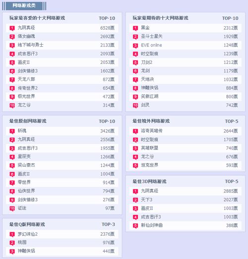 首先玩家最喜爱的十大网络游戏榜单中“九阴真经”“倩女幽魂”“地下城与勇士”始终占据前三甲的位置,不难看出玩家们对这三款游戏的情有独钟。而人气颇高的“剑侠情缘3”则被“成吉思汗3”和“画皮II”赶超,看来是处处不可松懈。玩家最期待的十大网络游戏榜单中“黑金”再次夺魁,一拥而上的“圣斗士星矢”“EVEonline”等游戏则在后方虎视眈眈随时有赶超的可能。最佳原创网络游戏榜中“斩魂”暂时领先,但以“九阴真经”和“成吉思汗3”的增长幅度来看之后可能又是另一番景象。最佳境外网络游戏榜中变化不大,“洛奇英雄传”稳居首位,而“梦幻诛仙2”则在最佳Q版网络游戏榜中遥遥领先,居后的游戏压力可想而知。页游方面“卧龙吟”“大侠传”“神曲”等游戏在玩家最喜爱的网页游戏榜上暗暗较劲,同时在玩家最期待的网页游戏榜上首位的“萌三国”则被黑马“童萌镇”紧追不舍。手游部分在最佳移动平台游戏榜单中“海扁西游记”和“捕鱼达人”始终在冠、亚位上争夺输赢,而“博雅斗地主”则逆流而上,占领本周最佳移动平台游戏榜首。