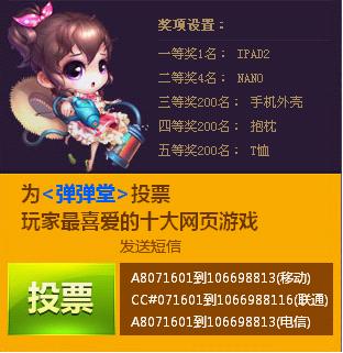 投票有惊喜,各种好礼大放送。凡为弹弹堂投票的亲们,均有机会获取弹弹堂精美小周边、Iphone手机壳、超值游戏礼包、ipad2、NANO等丰厚奖品。还等什么,赶紧为你喜爱的弹弹堂投上宝贵的一票吧。