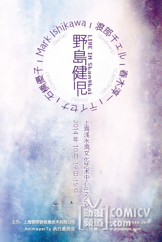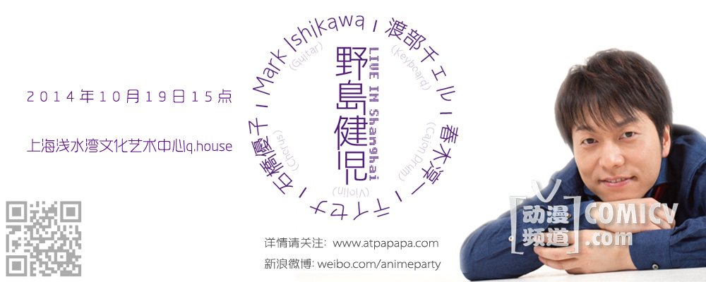 2014年10月19日,曾参与过《美少女战士Sailor Moon-crystal》(地场卫/夜礼服假面) 、《圣斗士星矢-圣域传说》(一辉) 、 《心理测量者》(宜野座伸元)等无数当红作品的日本著名声优兼歌手野岛健儿,将携众多著名音乐制作人来到上海浅水湾文化艺术中心举办在华首场个人live。