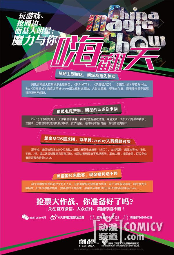 漫半拍、猫四弦现场主持2015魔力社团大赛(MCC)现场选拔赛。血纯茗雅、魔王Willie、行云、枣糕、极二区等超豪华明星嘉宾团现场互动。文艺广播“最文艺coser”评选、封面大赛明星coser现场真人秀;星光大道社团列阵;百位专业摄影师聚焦最美coser……