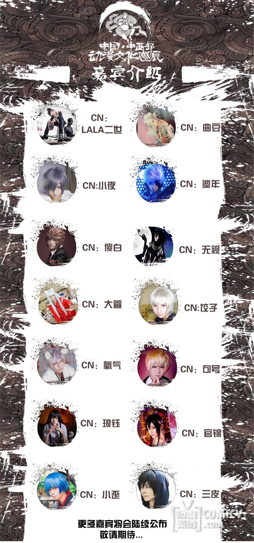 本次巡展嘉宾阵容庞大,优质coser众多。一期公布嘉宾名单有LALA二世、曲豆、鎏年、小夜、无视、傻白、饺子、氧气、官锦、琅钰等嘉宾。更多嘉宾名单持续公布中,敬请期待。