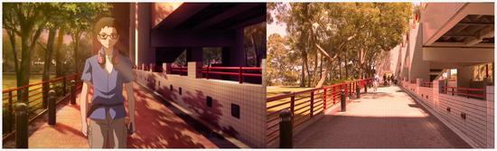 图中学校正门的这一个电梯,通向校园最核心的主干道,若不是有人物在,小编简直分不清这两张图哪张是实景,哪张是动画了。