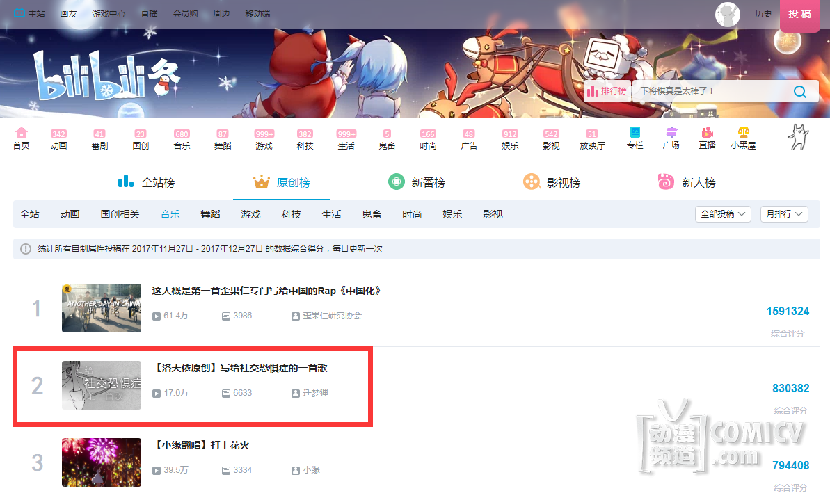 其中《写给社交恐惧症的一首歌》PV一经上线,直逼B站首页音乐区三日榜第3名!12月27日,历时仅仅十三天,《写给社交恐惧症的一首歌》PV再次创造奇迹,荣登B站原创音乐排行榜月榜第2名宝座!据悉,幻音音乐第二期P主扶持计划回归倒计时。